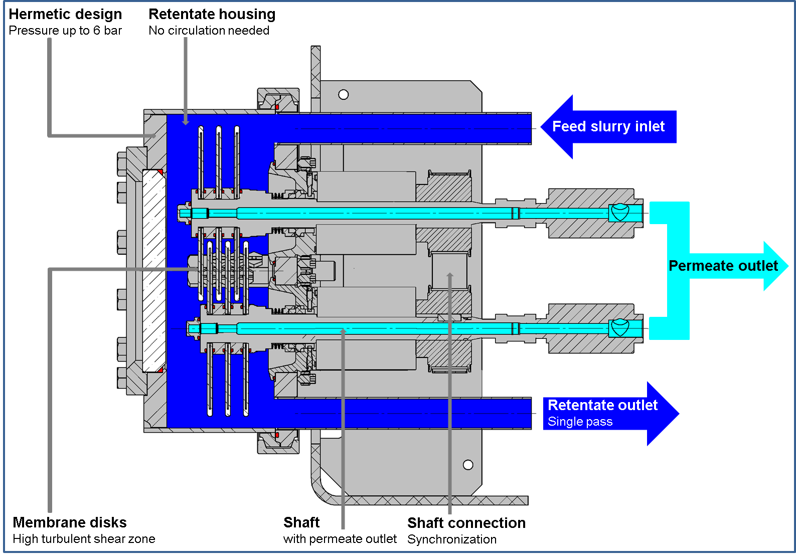 Filtr dynamiczny z przepływem krzyżowym Krauss-Maffei DCF nadaje się do klarowania cieczy oraz do zatężania i przemywania ciał stałych w szerokiej gamie produktów chemicznych i biochemicznych. Bez względu na to, czy cenne produkty są ciałami stałymi, czy płynami, dynamiczny filtr krzyżowy Krauss-Maffei DCF zwiększa wydajność i jakość produktu.
