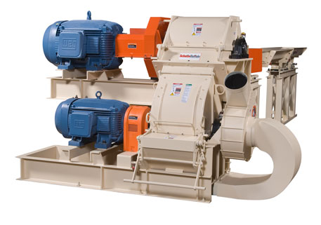 Podwójny młyn młotkowy drobnego mielenia Shutte Buffalo serii FG i FGZ do domielania wstępnie rozdrobnionych lub niewielkich odpadów drewnianych do uziarnienia produktu na poziomie mączki/pyłu w pojedynczym procesie przy użyciu jednego młyna młotkowego.