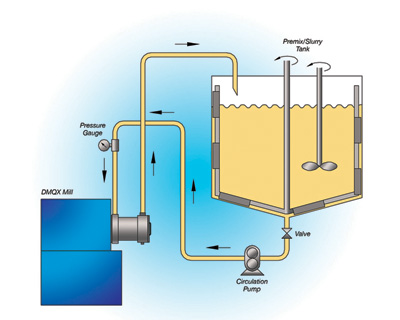 Dodatkowe korzyści mielenia cyrkulacyjnego obejmują węższy rozkład wielkości cząstek, zdolność do ciągłego monitorowania zawiesiny, dodawanie składników do zbiornika premiksu w dowolnym momencie podczas cyklu mielenia i kontrolowania temperatury bardziej dokładnie, ponieważ zawiesina zużywa tylko 15-25 sekund podczas mielenia. izba.